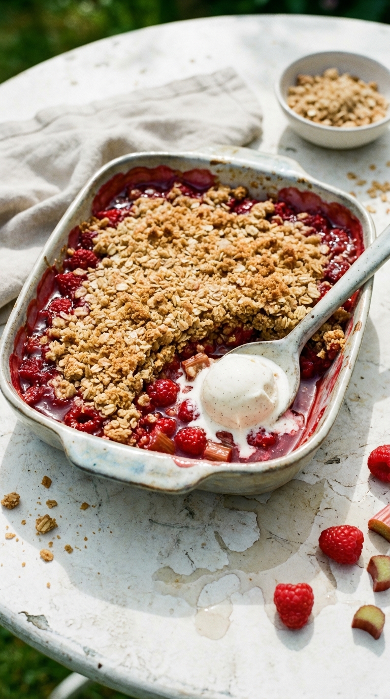 A delightful crisp combining the tartness of rhubarb and the sweetness of raspberries, perfect when served warm with a scoop of ice cream.