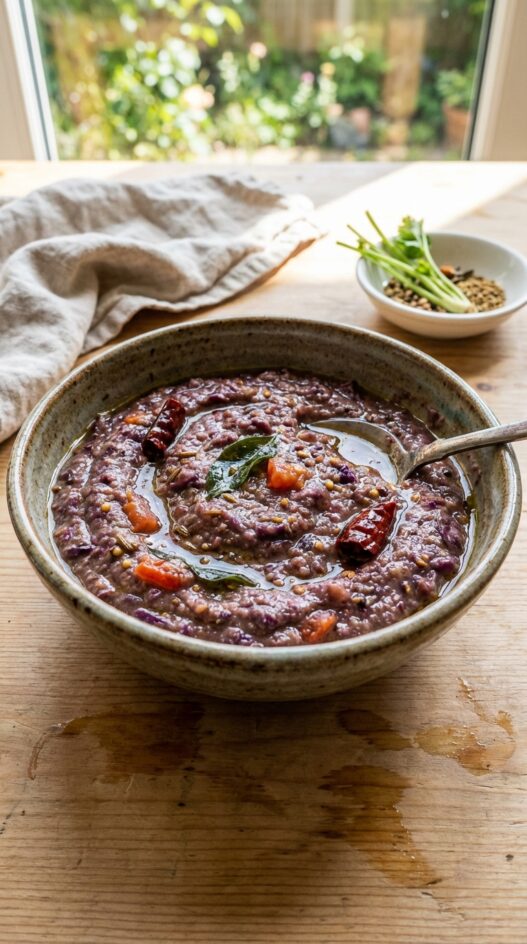 This is not the sweet European chutney you might expect from the name. It is Indian. Red cabbage grated fine, cooked with a coriander-garlic-ginger paste, tempered in oil with cumin seeds, curry leaves, mustard seeds, and dried red chiles. Tamarind and jaggery go in near the end for sourness and sweetness. Everything cooks down into a thick, deeply spiced condiment that bears almost no resemblance to the cabbage it started as.