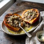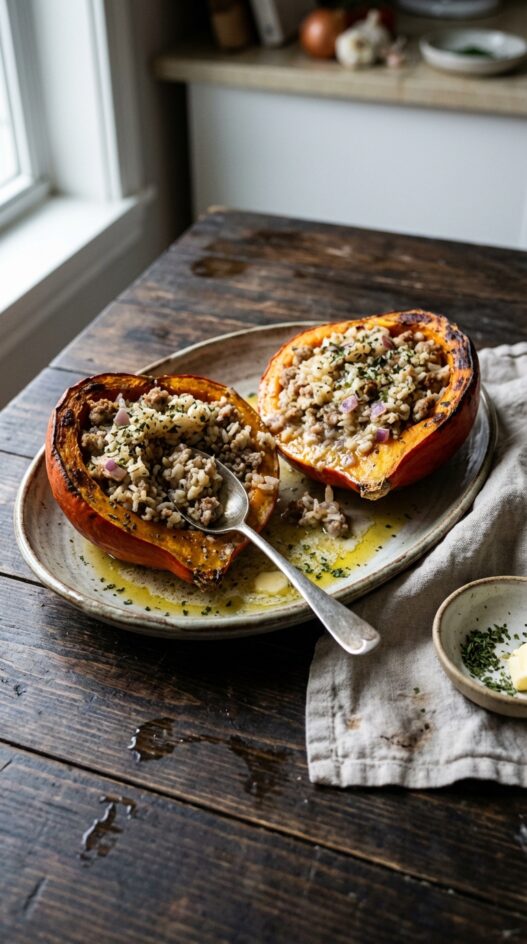 Sweet kuri squash is baked until tender, then filled with a savory mix of sausage, rice, and coconut milk. A comforting, flavorful fall meal.