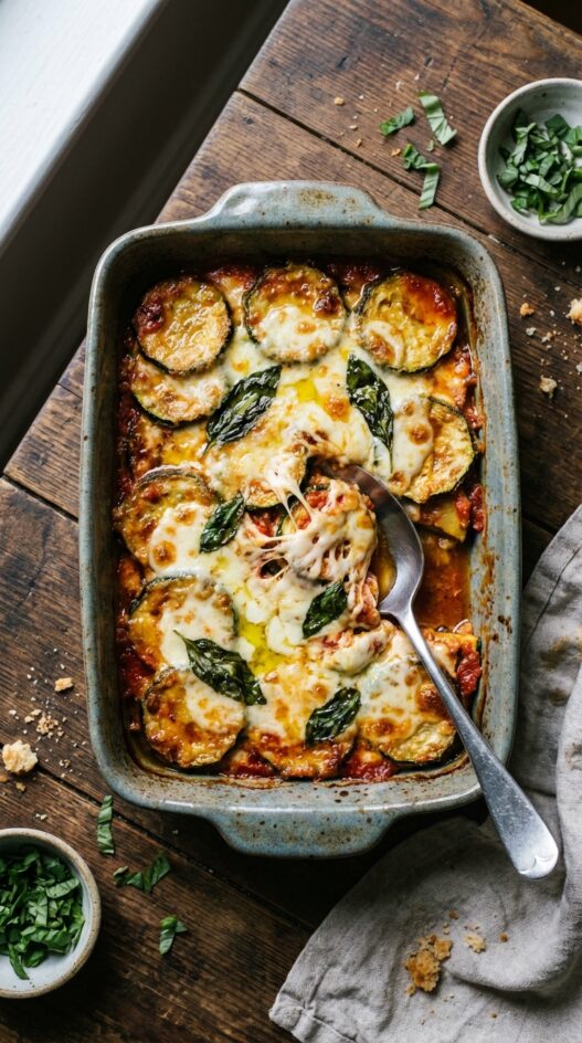 Zucchini has a higher water content than eggplant, so it benefits from salting and pressing before cooking to prevent the final dish from becoming watery. The flavor is milder, which lets the tomato sauce and cheese take center stage.