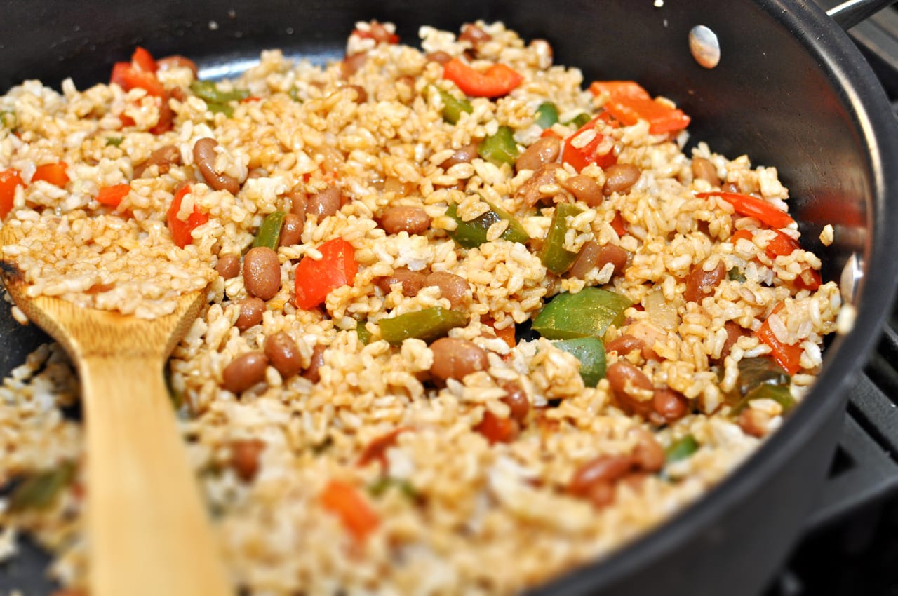 I have some tried and true recipes that I have memorized by heart. I have others I am dying to try from my newest cookbooks. But on some nights, I just look in the pantry and make it up as I go. That’s exactly what I did with this rice and beans dish.