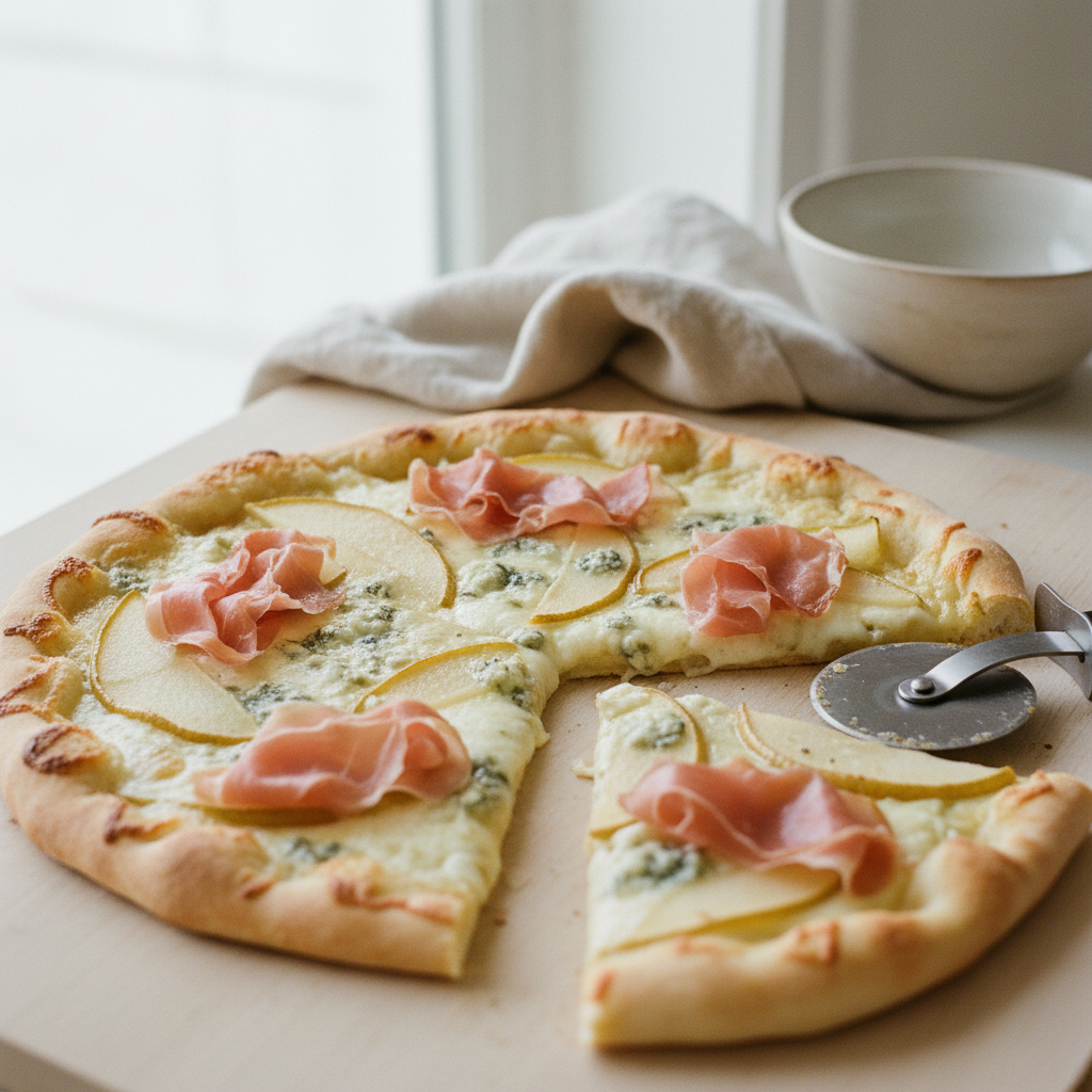 - Layer the dough with shredded Italian cheese, then top with pear slices, prosciutto, and gorgonzola cheese chunks.
