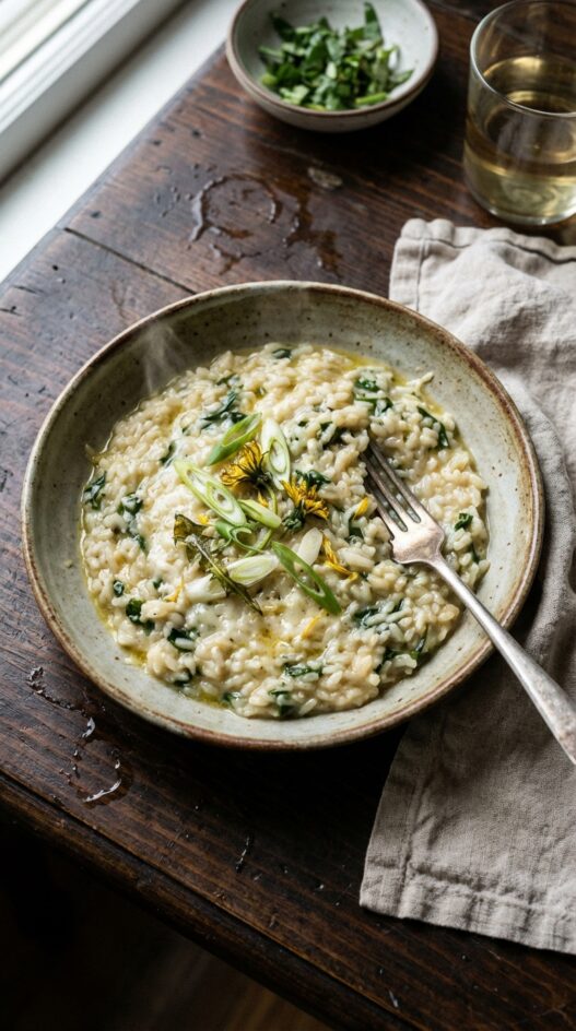 - Garnish with the sliced green onion stems and any dandelion petals. Serve the risotto hot, ensuring it maintains its creamy texture.