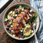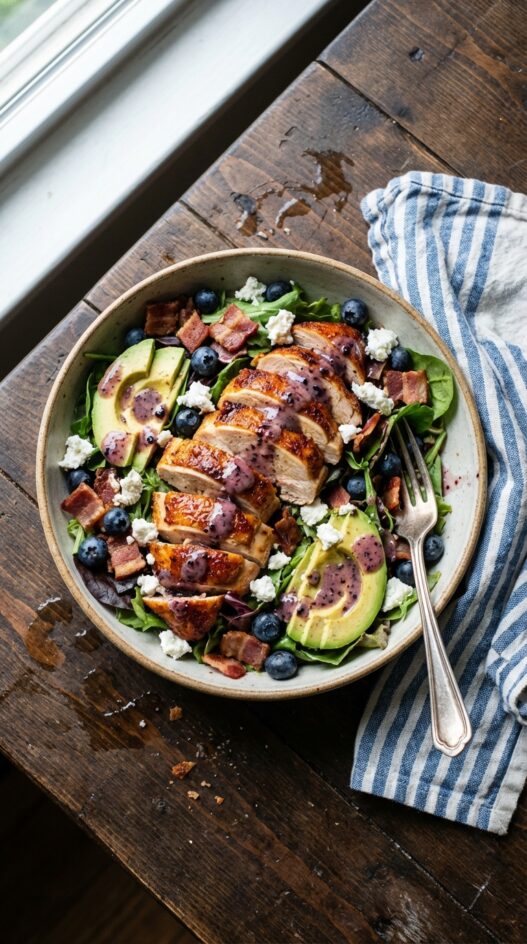 A hearty salad packed with roast chicken, bacon, and creamy chèvre. Sweet blueberries add a surprising twist!