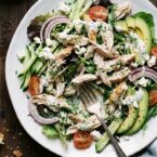 Cold roast chicken is one of the most underrated things in the fridge. Keep it simple. Torn into shreds, laid over good salad leaves with cucumber, avocado, a few grape tomatoes, and crumbled feta, it becomes a proper meal without any cooking at all. This is a composed salad: each ingredient goes on deliberately, not tossed together at the last minute. The difference in how it looks on the plate is significant. Dress it lightly; the chicken and vegetables have enough going on without being drowned. Maldon salt and fresh dill at the end, and you have something that looks considered and takes about eight minutes to put together.