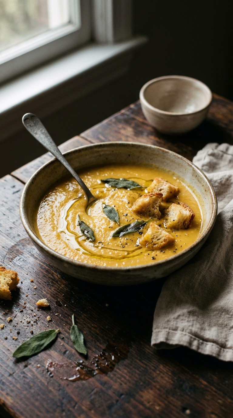 - Garnish with a drizzle of olive oil, sage, and croutons.