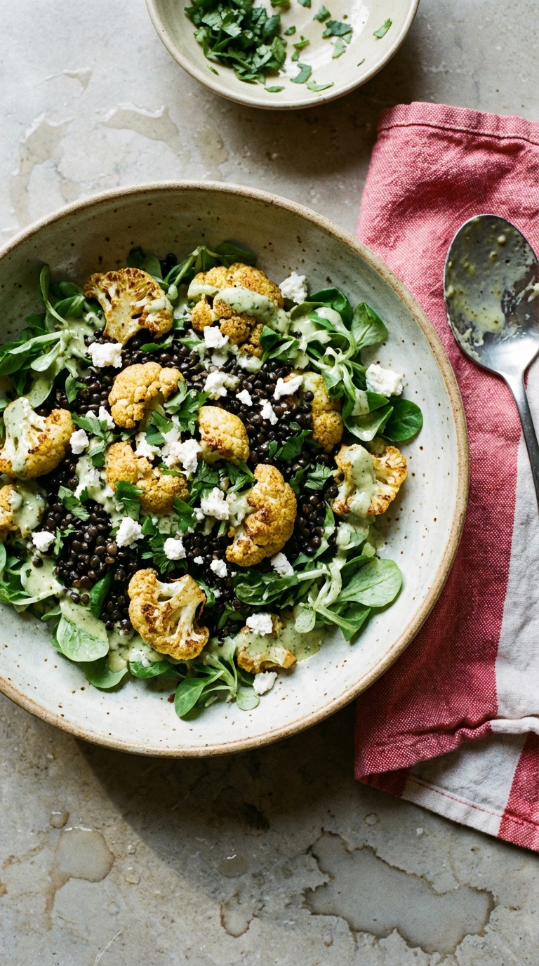 Cauliflower gets a bad reputation mostly because people undercook it. Roast it at high heat until the edges go brown and slightly crispy, and it becomes a completely different vegetable. Pair it with beluga lentils, which hold their shape and have an earthy depth that ordinary green lentils can’t match, and you have a salad that actually fills you up. The ramp tahini dressing is the reason to make this in spring when ramps are around; the rest of the year a good scallion substitutes reasonably well, though it won’t have the same garlicky punch. Mache is the right green here, soft and mild enough not to fight the other flavors. If you can’t find it, something equally delicate works better than assertive leaves. Skip the goat cheese if you want, but it rounds off the acidity nicely and adds a creaminess the dish needs without a protein. This is a lunch salad that also works as a side at dinner, and it improves after 20 minutes of sitting once dressed.