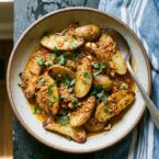 Hearty fingerling potatoes roasted to perfection, then tossed in a vibrant romesco sauce. Topped with hazelnuts and fresh herbs for a delicious side.