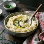 Usually I make my mashed potatoes with sour cream. I’ve got to say, they’re delicious, boiling the potatoes in salted chicken stock gives extra flavor right from the start. And then, they’re given an extra boost with a healthy dose of sour cream.