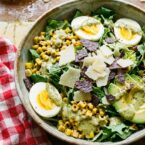 This salad is absolutely worth getting your blender dirty for, which you know is the hardest part of any recipe. I wanted it to be hardy enough for a meal so we’ve thrown in some hard boiled eggs and avocado and tortilla chips that make it a party. Mike adored the dressing. I think “best” and “I’ve ever had” were strung together in a sentence somewhere in there.