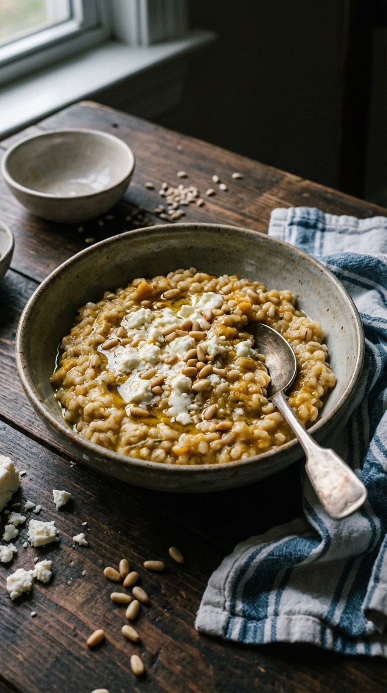 A vibrant vegetarian risotto featuring roasted pumpkin, pearl barley, and topped with feta and pine nuts. Perfect for a cozy weeknight meal.