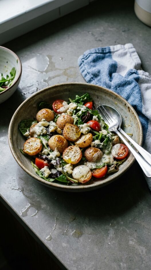 This salad however requires no skill, tension, or problem solving. Love that. Roasted radishes! Where have you been all my life? These spicy little guys turn sweet, and taste just like turnips when roasted. Being summer, these were destined for a salad, just add Gorgonzola crumbles, tomatoes from my garden and a mix o’ leaves. Oh, and don’t forget a drizzle of blue cheese dressing!