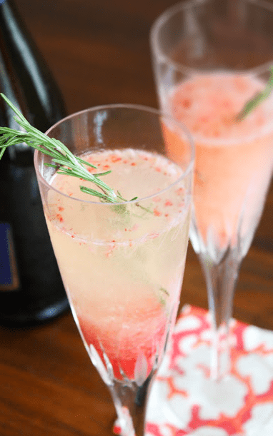 - Spoon a tablespoon of puree into the bottom of a champagne glass, pour prosecco over it and garnish with a rosemary sprig. Feel free to stir for a pretty pink color and more even flavor.