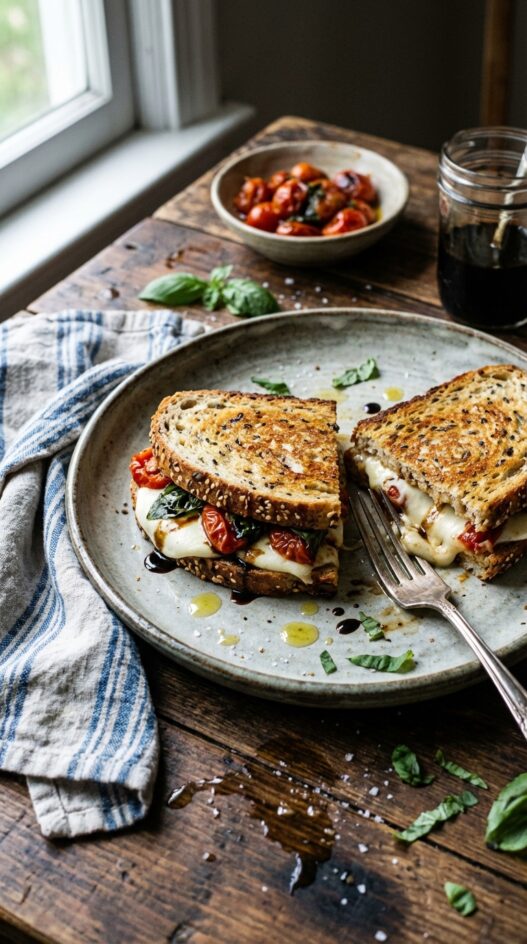 A grilled cheese with roasted tomatoes and fresh mozzarella is about three decisions made well: slow-roasted tomatoes, a balsamic reduction that takes fifteen minutes, and good bread. Seedy bread holds up better than white sandwich bread here. Roasting the tomatoes concentrates their flavor and removes moisture so the sandwich doesn’t turn soggy. That matters more than any other single step.