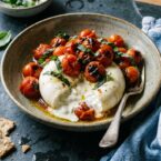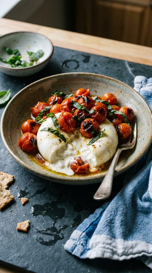 Sweet roasted tomatoes and creamy burrata make a simple yet elegant appetizer or side. Perfect with crusty bread or crackers.