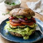 This roasted vegetable sandwich feels rather burger-like in look and heartiness. But don’t be fooled. It’s nothing more nor less than a stack of roasted vegetables slathered with a creamy avocado-basil aioli and jazzed up with a frilly piece of butter lettuce. Roasted portobello caps serve as buns, and roasted zucchini, tomatoes, red onion, and red peppers are piled high within to yield layers of flavor and texture. The “buns” are slathered with an avocado-basil sauce, which is simply avocado, basil, garlic, lemon juice, and a pinch of salt.