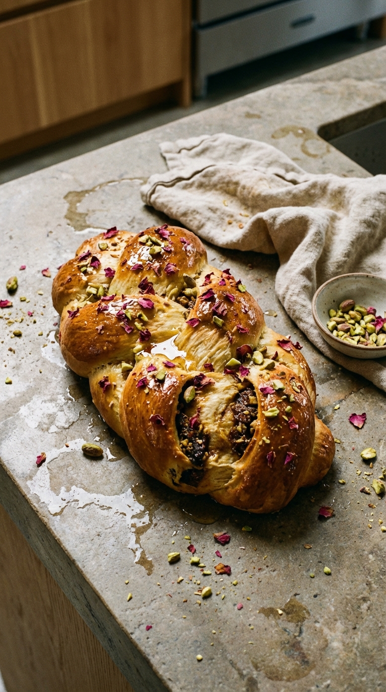 - Brush challahs with egg wash and honey, and sprinkle with rose petals and pistachios.