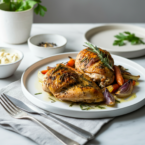Juicy chicken breasts roast alongside tender carrots and red onion in a flavorful herb marinade. Ready in under an hour!