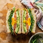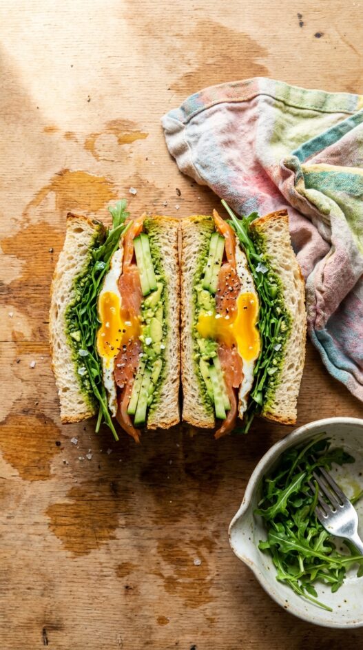 This smoked salmon, avocado and pesto breakfast sandwich, piled high with arugula, crisp cucumbers and topped off with a runny fried egg, is worth waking up early (or being late to work!) for.