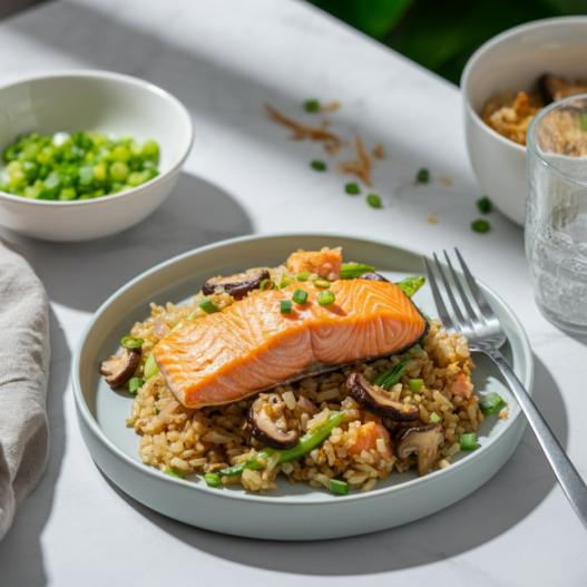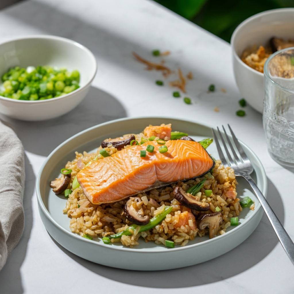 A comforting twist on classic fried rice. Flaky salmon and earthy shiitake mushrooms make this a hearty, flavorful meal.
