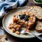 Indulge in the savory, ocean briny flavor of fresh and smoked salmon, paired with the tart, mildly pungent flavor of whole grain mustard. Caviar really takes it over the top for a festive meal, but the salmon tartare is just as delicious without it.