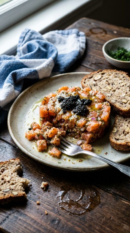 A sophisticated appetizer featuring fresh, sushi-grade salmon, bright dill, and a hint of Dijon. Perfect for a special occasion.