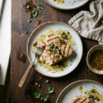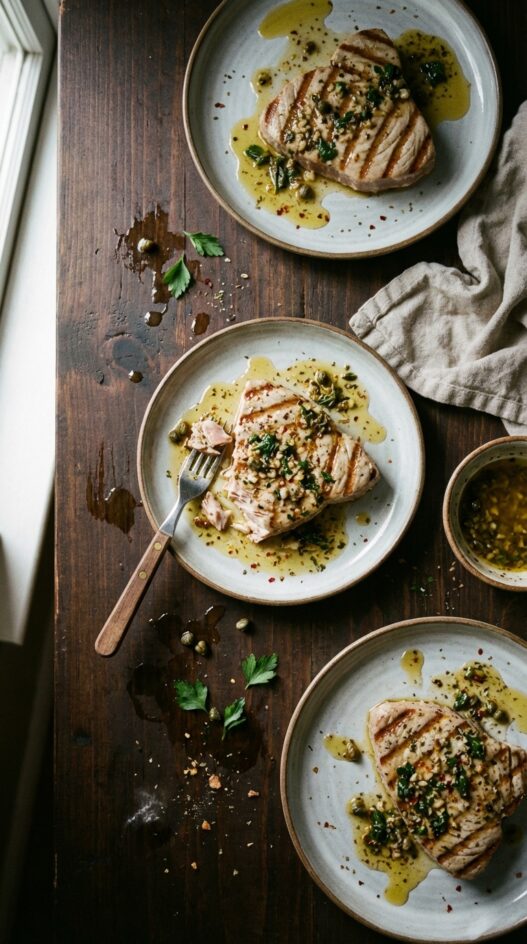 Seared tuna steaks get a vibrant flavor boost from a bright, fresh salmoriglio sauce made right in the pan. Quick, delicious, and perfect for a weeknight meal.