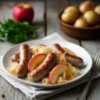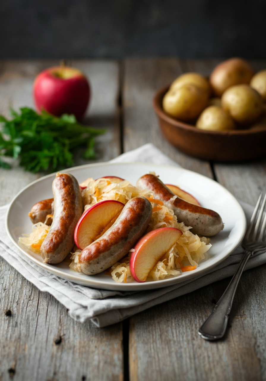 Savory bratwurst and tangy sauerkraut mingle with sweet apples and creamy mashed potatoes. A hearty, flavorful meal.