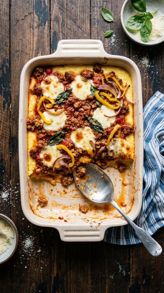 - Spread the polenta on the bottom of a lightly oiled 9×13 baking dish. Ladle sausage and tomato sauce over the polenta. Arrange peppers and onions in an even layer over the sausage. Sprinkle with parmesan and top with mozzarella rounds.
