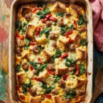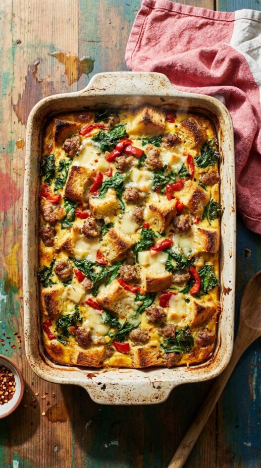 Hearty strata brimming with sausage, kale, and cheese, baked in sourdough for extra flavor. Perfect for brunch or a weekend breakfast.