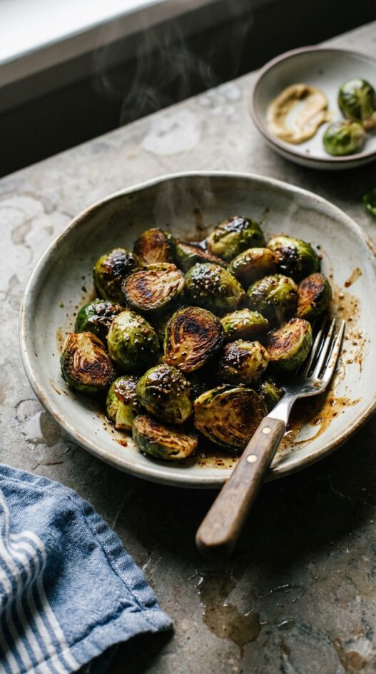 Add the Dijon and balsamic after the sprouts are seared, with the heat still on. Toss quickly so the glaze coats everything and reduces slightly. It’s sharp and tangy against the bitter sprouts, a pairing that works whether you’re serving these alongside roast chicken or a simple grain bowl.