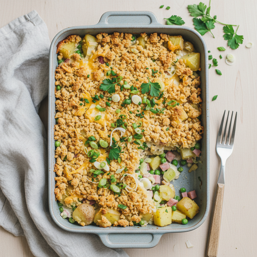 This comforting savory potato crumble is loaded with ham and cheddar cheese and a topping of chives for a touch of spring.