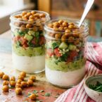 - Using two glasses or jars, divide yogurt, tomato-cucumber mixture, avocado, and crispy chickpeas between the two.