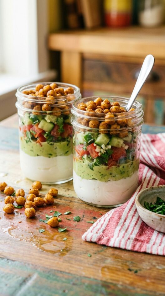 Layers of creamy yogurt, crunchy chickpeas, and fresh veggies make this parfait a satisfying and healthy meal or snack. Perfect for lunch or a light dinner.
