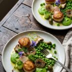 An elegant, restaurant-worthy dish featuring perfectly seared scallops atop a vibrant, fresh pea purée. Garnished with fresh herbs and vegetables, it’s a celebration of spring flavors.