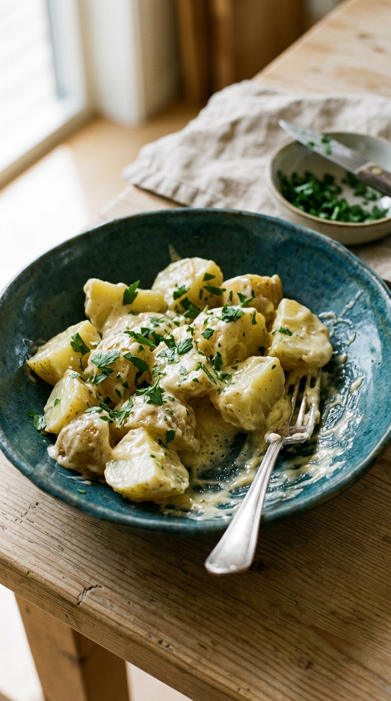 - Peel the potatoes and cut into chunks, put them in a salad bowl or in individual small bowls. Add the sauce to the potato chunks and toss to cover well.