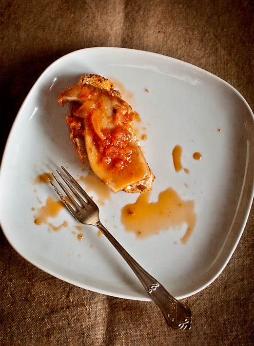 It’s mushroom season here in Spain. This year it took a while for it to arrive because of the drought, but it finally did. An excellent opportunity to make a delicious starter or appetizer with mushrooms. This recipe for marinated mushrooms on toast, a mostly classic escabeche, is by Mr. José Andrés. He advises to use a mixture of wild mushrooms, but I happened to find some wild porcini mushrooms at my greengrocers that I could not overlook and I had to make me some boletus escabechados. So cute and chubby they were, these boletus… and they looked at me with their tiny boletus eyes… But I took them by the hand, carried them home and cook them all the same. I was merciless, just like the Walrus and the Carpenter with the oysters.