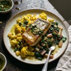 - To serve: Give cauliflower one last stir. Place some cauliflower on half the plate, chard on the other. Top with fish and a drizzle of sauce verte. Serve more sauce verte at the table.
