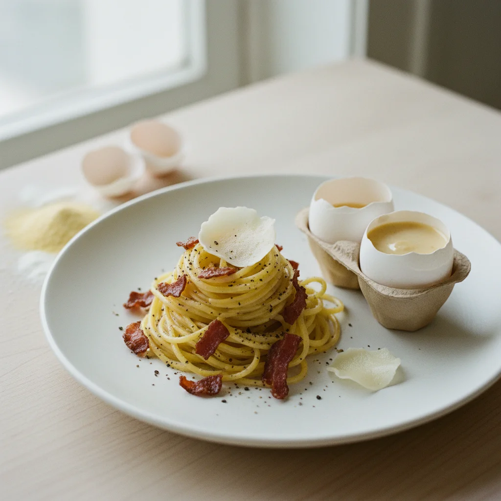 - Place a tagliolini nest in the center of the plate. Sprinkle with black pepper and place a slice of dehydrated prosciutto on top. Serve with the 60°C (140°F) sauce in an eggshell with a milk chip placed nearby.