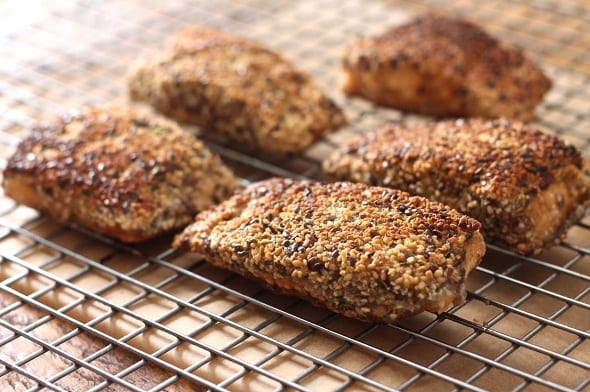 - Dust the char in the flour, dip it in the eggs, and roll in the seed mixture.