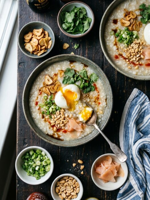 You can add kimchi, a soft boiled egg, scallions, and soy sauce to your congee. Feel free to include any other toppings that Mom enjoys.