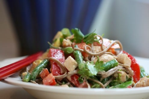 - Add the cooked soba noodles, chicken, sautéed squash, blanched red pepper, green beans, and carrots to the bowl with the dressing. Toss to combine.