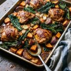 After a busy week, instead of falling back on our Sunday night dinner on repeat for the entire week, I decided to take all its best components and turn it into something fully homemade: a sheet pan chicken dinner with a tangy marinade to create the perfect sweet and spicy jus.
