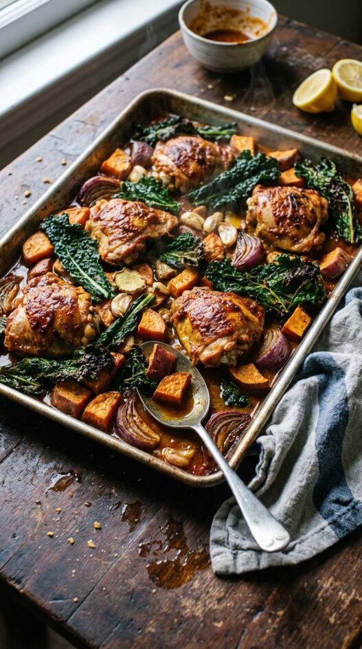 Sheet pan dinners are a lifesaver! This curry chicken with kale is flavorful, healthy, and ready in under an hour.