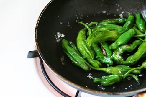 - Add the shishito peppers, a pinch of salt, and freshly ground black pepper. Sauté for five minutes, or until the skin starts to blister.
