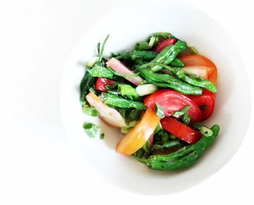 I discovered this varietal while browsing through the farmer’s market several weeks ago. It totally changed my perception of peppers, since I am not a big of a fan of the classic red pepper myself. The shishito pepper is a Japanese varietal that is mostly sweet with an occasional spicy pepper intermingled in the bunch. Their delicate walls are deceivingly meaty. The slightly bitter aftertaste only adds to its complex flavor. Because they are small, there is no need to remove the either the insides or the stems. Cook the peppers with olive oil and salt for a quick five minutes, then mix with sliced heirloom tomatoes, cilantro and green onions for a quick, refreshing summer salad. The combination of sweet tomatoes, sweet, and occasional spicy, peppers is unexpected. The contrasting flavors, textures and temperatures is like a having a party in your mouth.