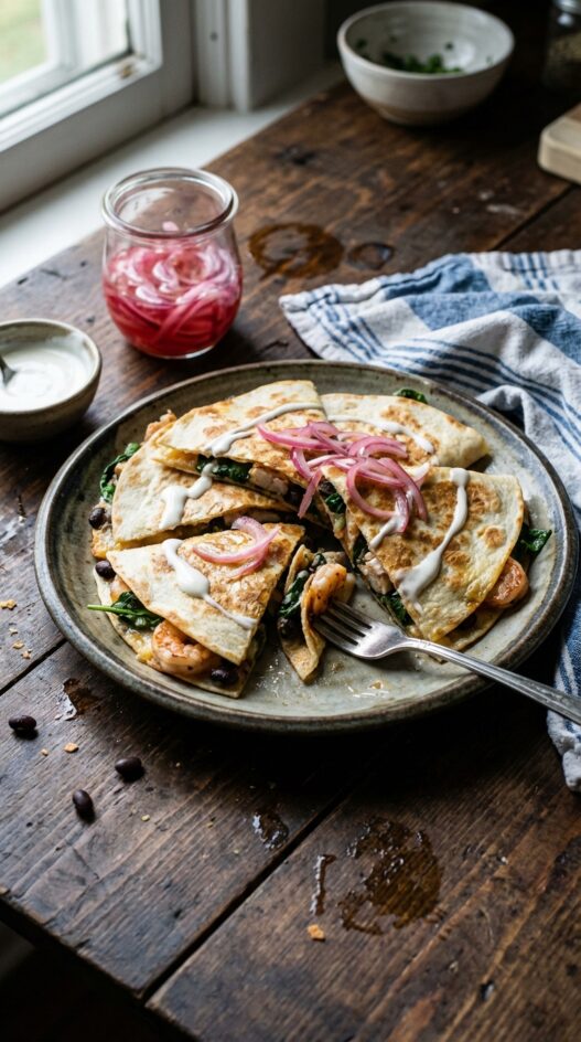 Next, you’ll assemble the quesadillas by layering tortillas with shredded cheese, the shrimp-spinach mixture, and black beans, then top them with another tortilla. Each quesadilla is pan-fried until crispy and golden brown on the outside, with the cheese perfectly melted on the inside.
