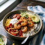 This Chili Lime Shrimp Fajita Bowl is easy, quick and super tasty. It’s absolutely perfect for a delicious lunch or easy weeknight dinner!