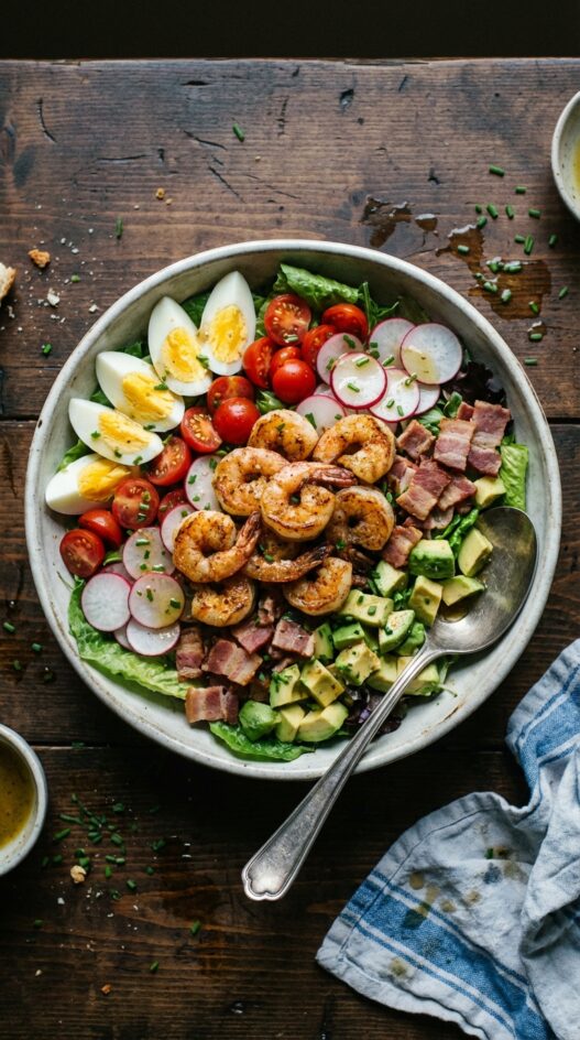 A vibrant salad with juicy shrimp, crisp bacon, and creamy avocado. Perfect for a light lunch or summer dinner.