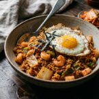 Savory kimchi fried rice gets a protein boost from shrimp. A fried egg on top makes it extra special.